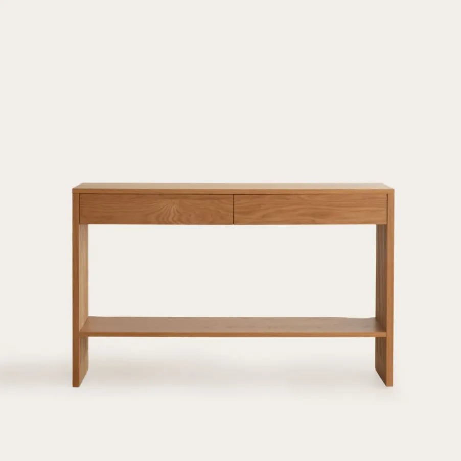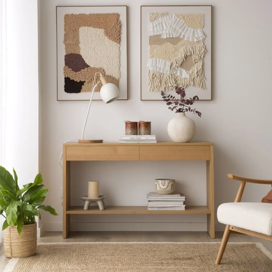 ¡Accueillez avec style japonais grâce au meuble d’entrée Haiku! Sa couleur chêne naturel et son design moderne font la différence. Avec son grand plateau de 120×35 cm, ses 2 tiroirs et l’étagère inférieure offrent de l’espace et de l’ordre pour vos clés et décorations préférées. De plus, les butées à la base protègent votre sol. C’est plus qu’un meuble, c’est un accueil chaleureux dans votre maison. Découvrez la chaleur et la fonctionnalité avec Haiku, rendant votre entrée plus que spéciale.