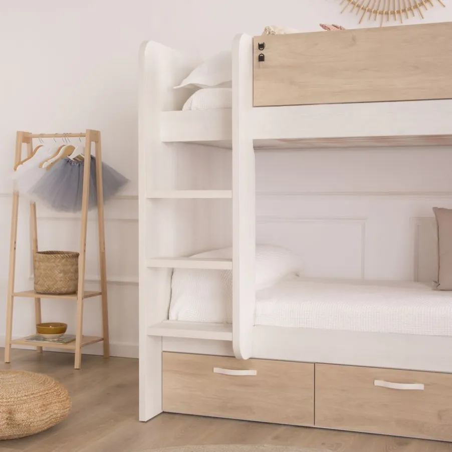 La photo montre le lit superposé Hansel avec l’échelle à gauche, une finition de structure en Blanc Norvège et une finition de façades de tiroirs et de barrière de protection en Duna Naturel.