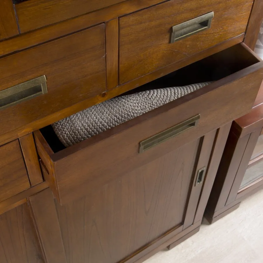 Élégante et pratique, la vitrine en bois couleur teck Kenia combine les éléments essentiels pour maximiser son utilité. Ainsi, dans sa partie supérieure, elle dispose de portes coulissantes vitrées, avec une décoration extérieure en croisillons en bois. Elle est suivie de cinq tiroirs pratiques, avec une capacité suffisante pour ranger votre linge de table et vos couverts, ainsi que de deux portes coulissantes inférieures, pour tout ce que vous souhaitez cacher. Pièce indispensable pour sa capacité et son harmonie.