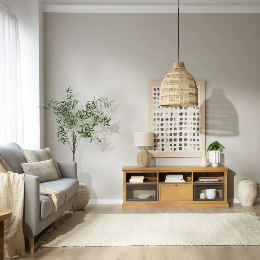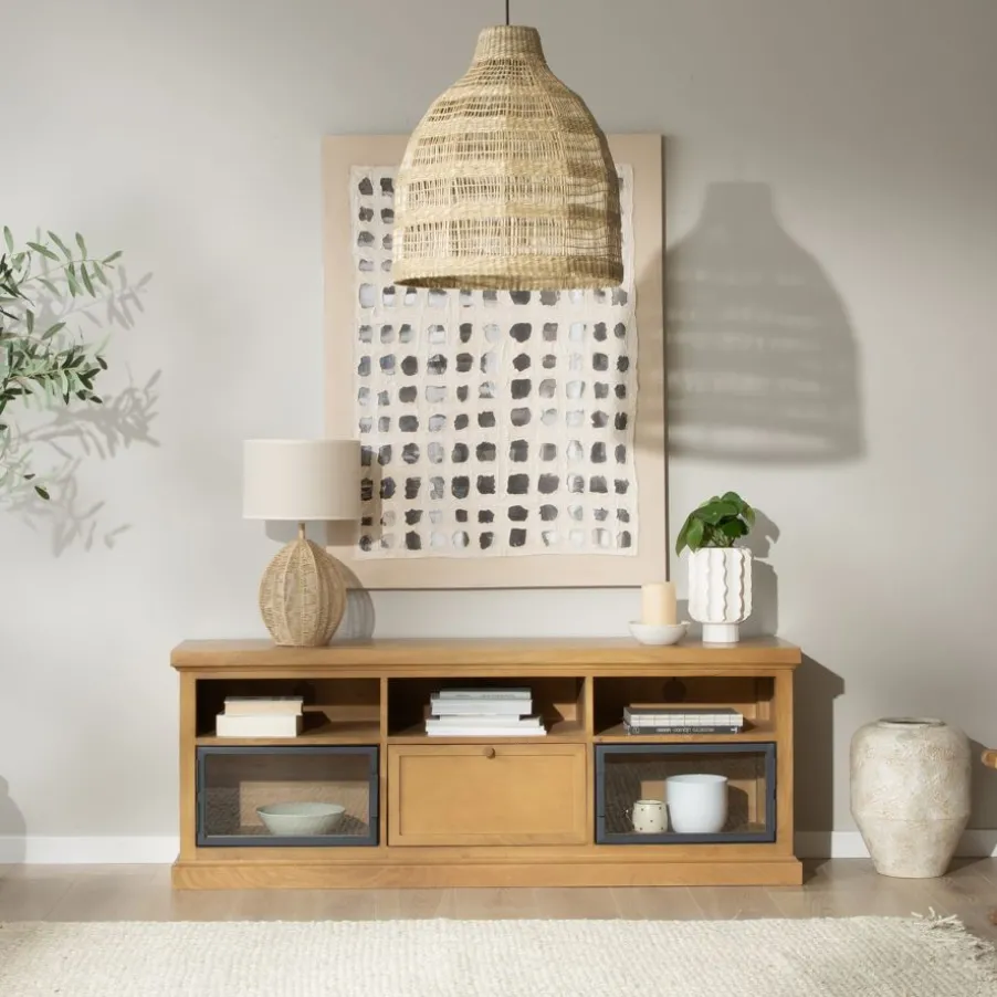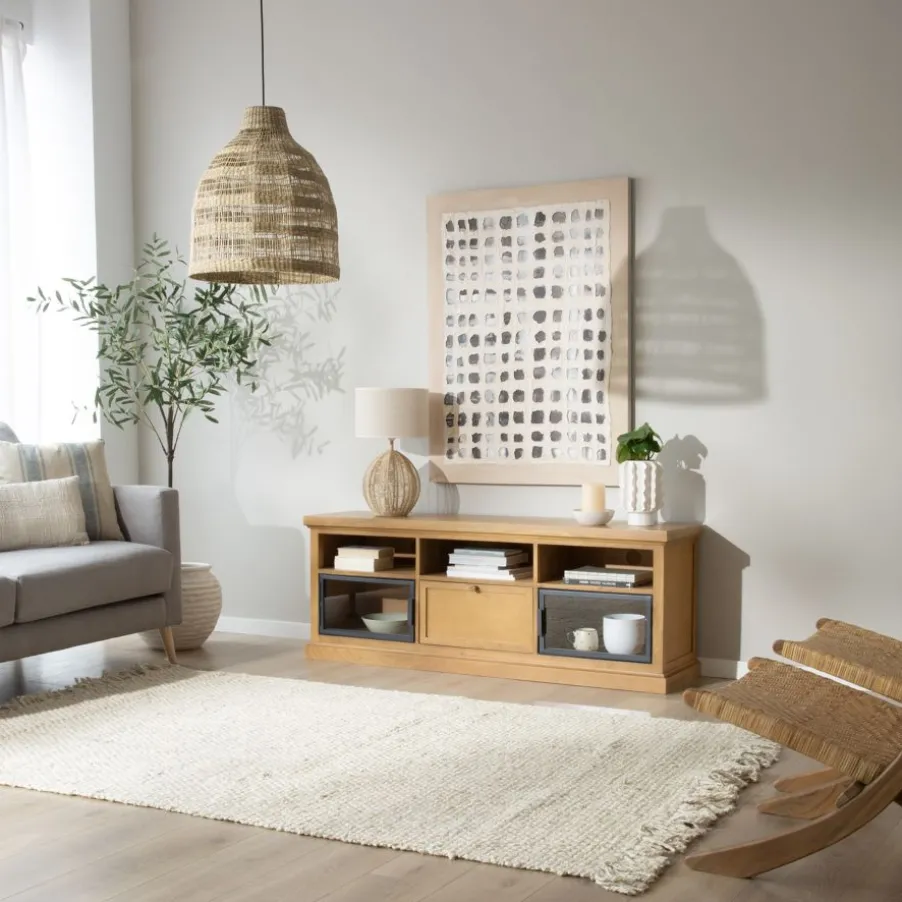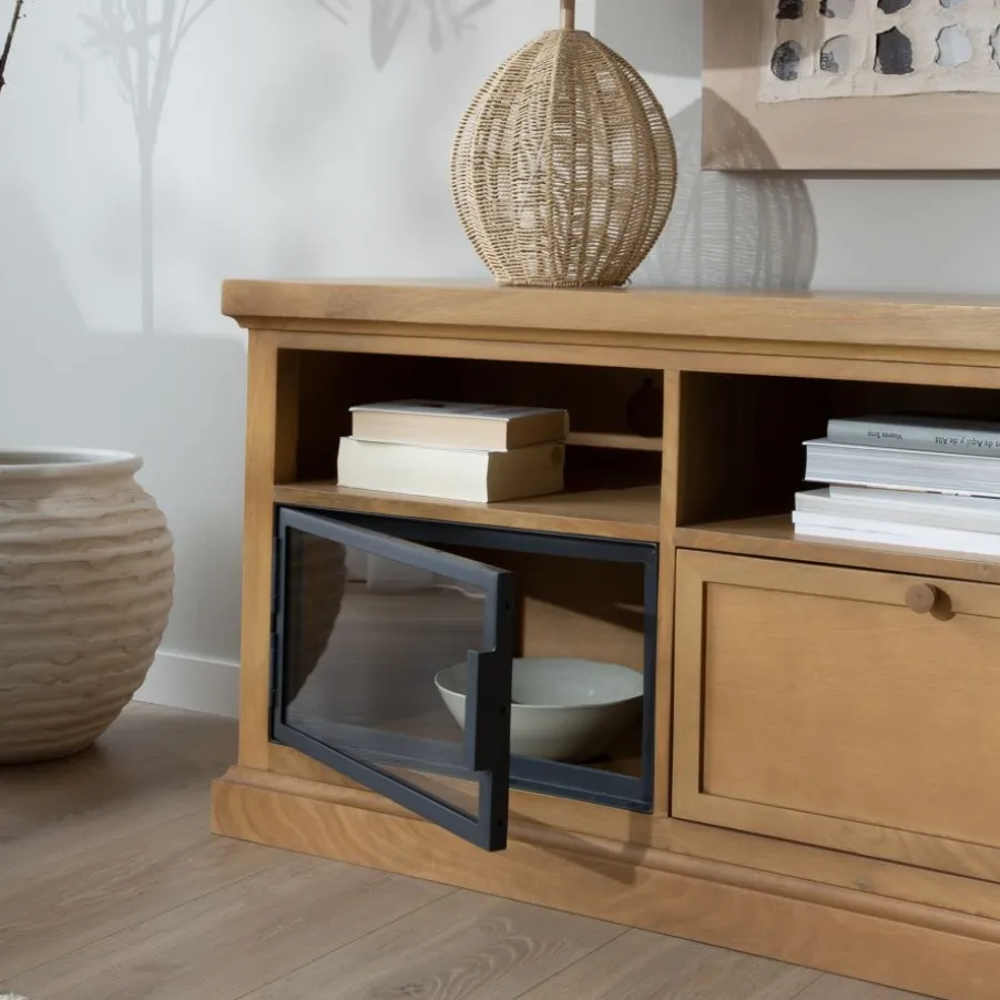Ajoutez une touche d’exotisme et de chaleur à votre maison avec ce meuble de style oriental/rustique. Fabriqué en bois massif et placage de mangue, il dispose d’un tiroir avec un guide en bois et de deux étagères à portes vitrées pour exposer vos objets préférés. De plus, ses trois étagères supérieures avec des trous arrière facilitent l’organisation des câbles de vos appareils électroniques. La finition de sa surface non seulement met en valeur son style naturel, mais simplifie également son nettoyage.